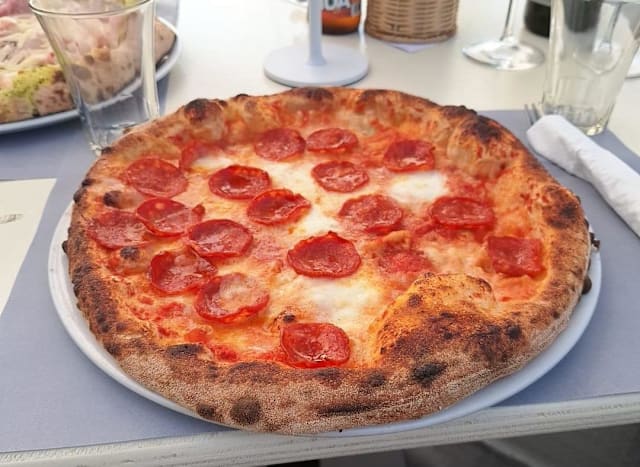 Salsa di pomodoro, fior di latte, acciughe di sciacca, olive nere, origano.