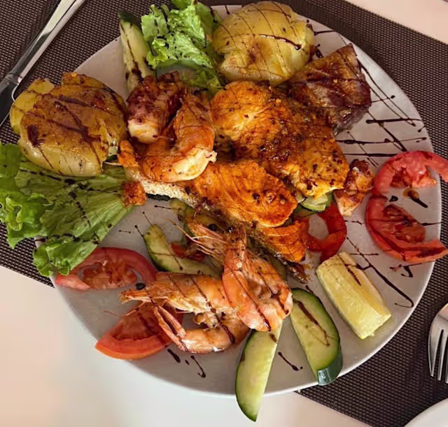 - (Salmão, atum, camarão, polvo, perca do nilo com vegetais grelhados e batata)