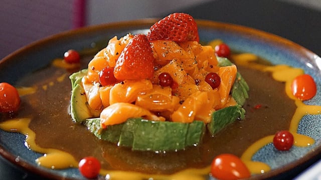Saumon cru, avocats, saumon snacké avec sa sauce anguille