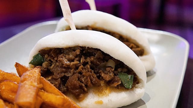 - Servis par 2, avec pain vapeur, bœuf sauté maison et frite de patate douce
