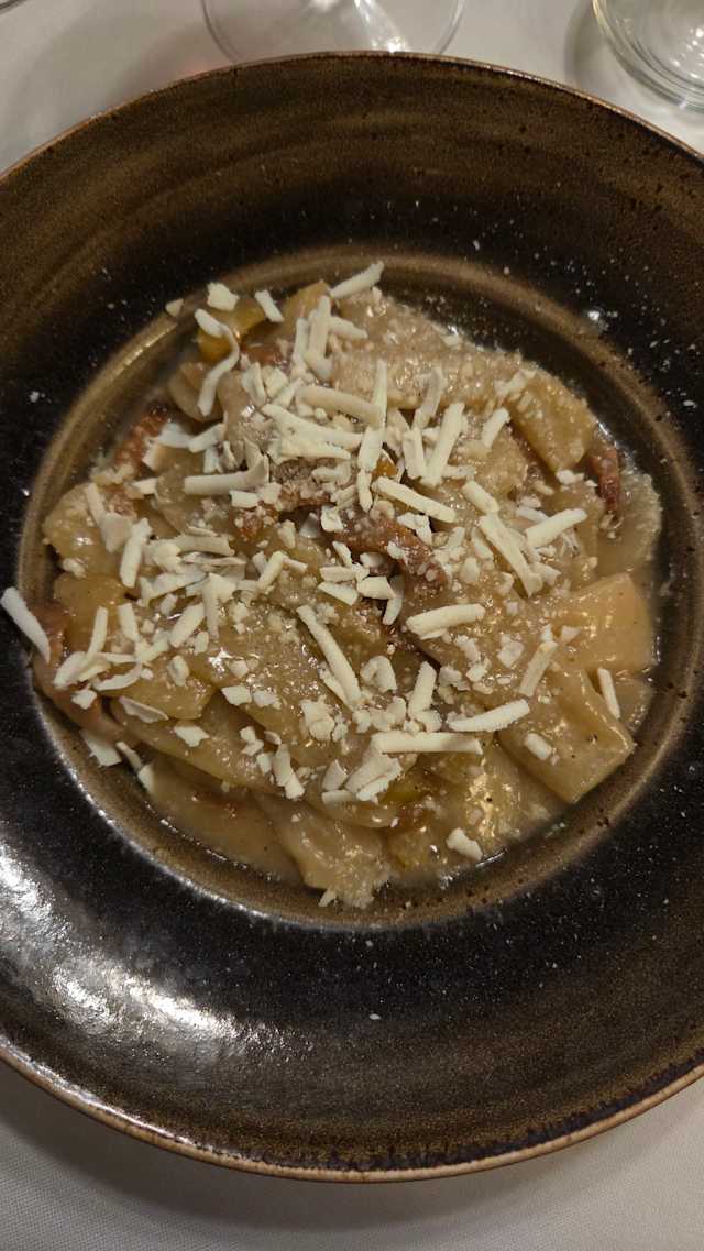 - Strozzapreti alla gricia con pere, guanciale di amatrice e ricotta aragusana, fatti in casa