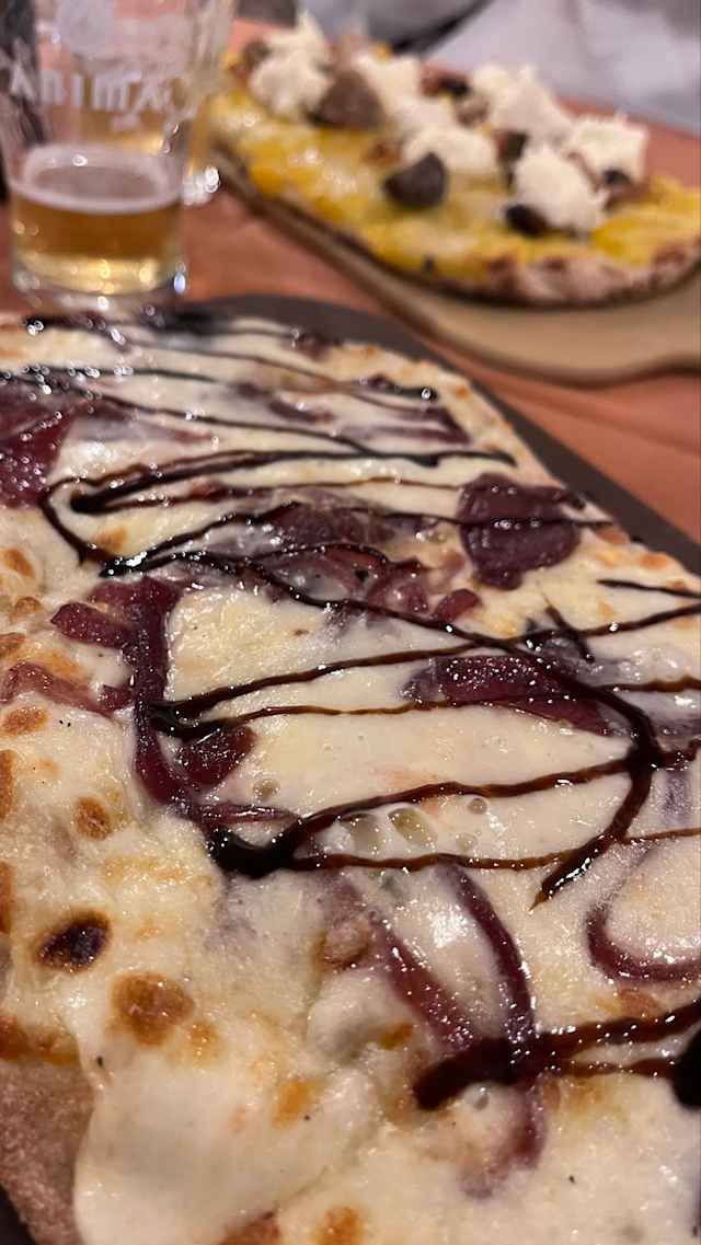 - Fior di latte, crema di gorgonzola, cipolle di tropea caramellate, fuori cottura: glassa di aceto balsamico