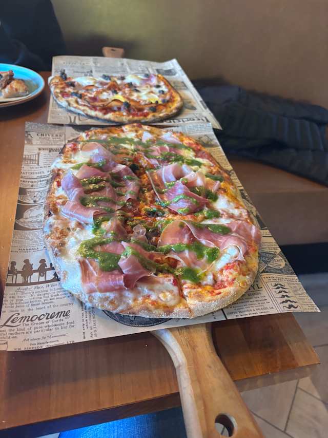 - Salsa de tomate, mozzarella fior di latte, burrata, prosciutto di Parma y pesto.
