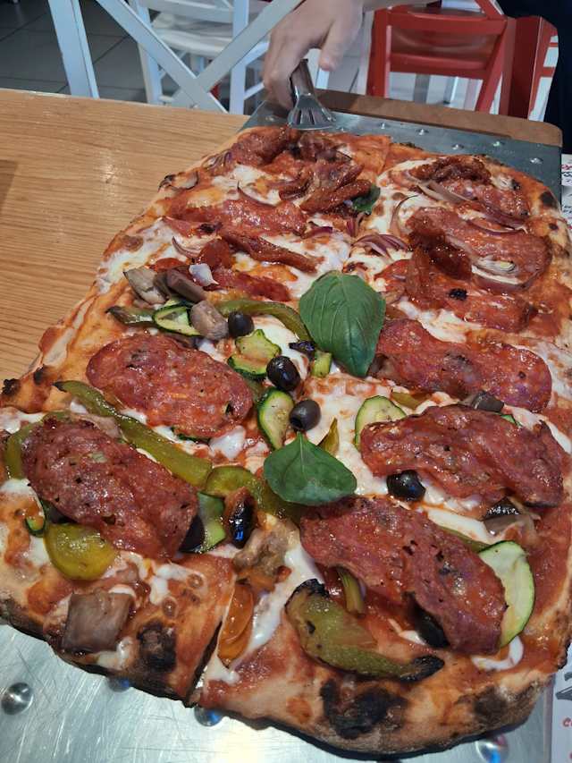 - Pomodoro, fior di latte, zola, salame Milano, olio, basilico