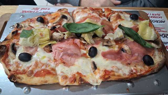 - Pomodoro, fior di latte,prosciutto cotto, olive nere, carciofi, funghi,olio, basilico