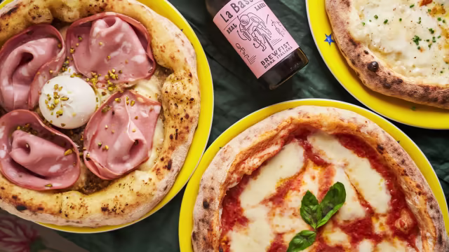 - Crème de pesto de pistache, mozzarella fior di latte, mortadelle de bologne IGP, stracciatella des pouilles, pesto de pistache, éclats de pistaches, basilic