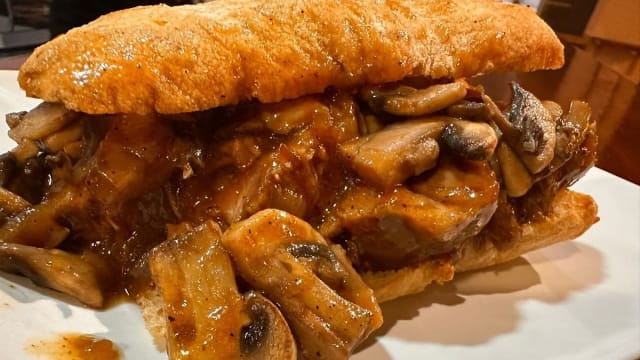 Pan chapata, aguja de cerdo ligeramente ahumada y un toque de salvia, marinada dos días y horneada con calma y paciencia 7 horas , cebolla y champiñones confitados con un toque de ajo y perejil.