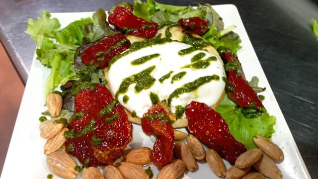 Pan pizza, mrtadela de boloña, burrata templada, aguacate y tomates secos rehidratados en aceite de oliva, servido en pan brioche