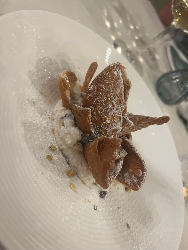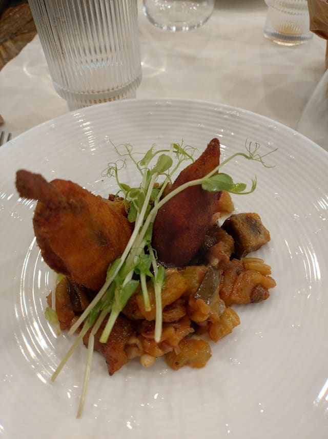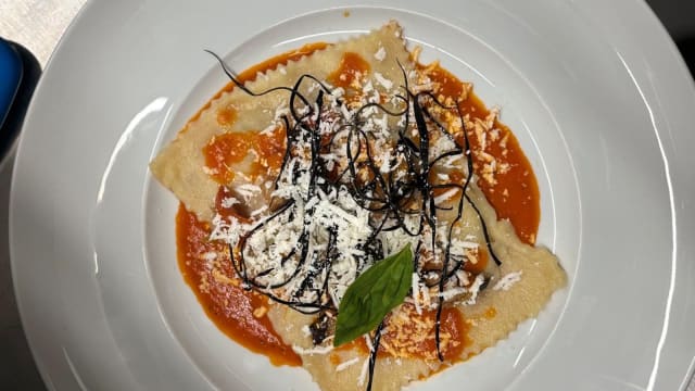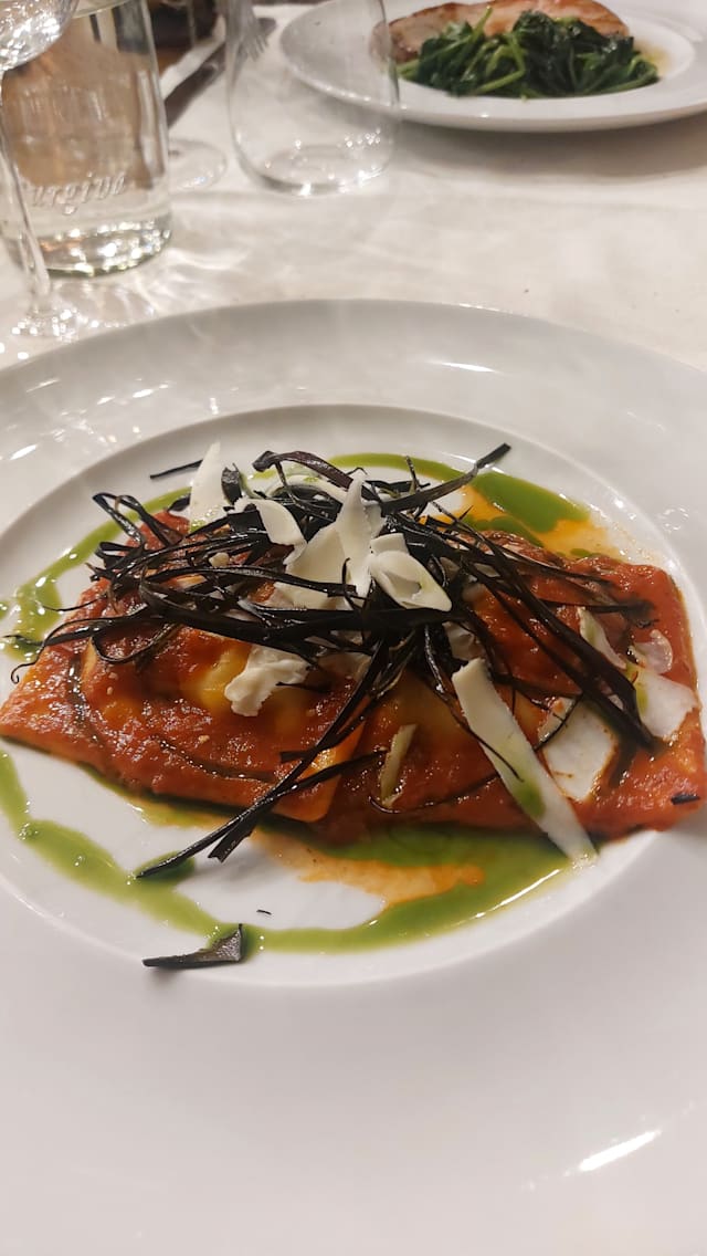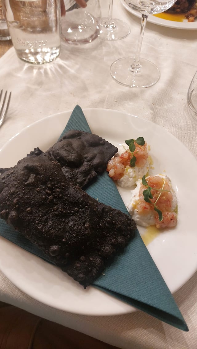 Ravioli di grano duro ripieni di ricotta di pecora serviti con ragù di nero di seppia