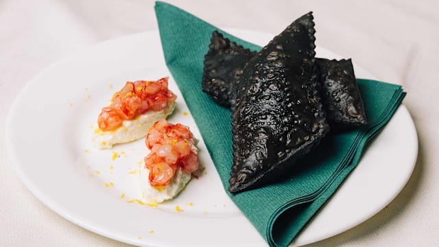 Ravioli di grano duro ripieni di ricotta di pecora serviti con ragù di nero di seppia