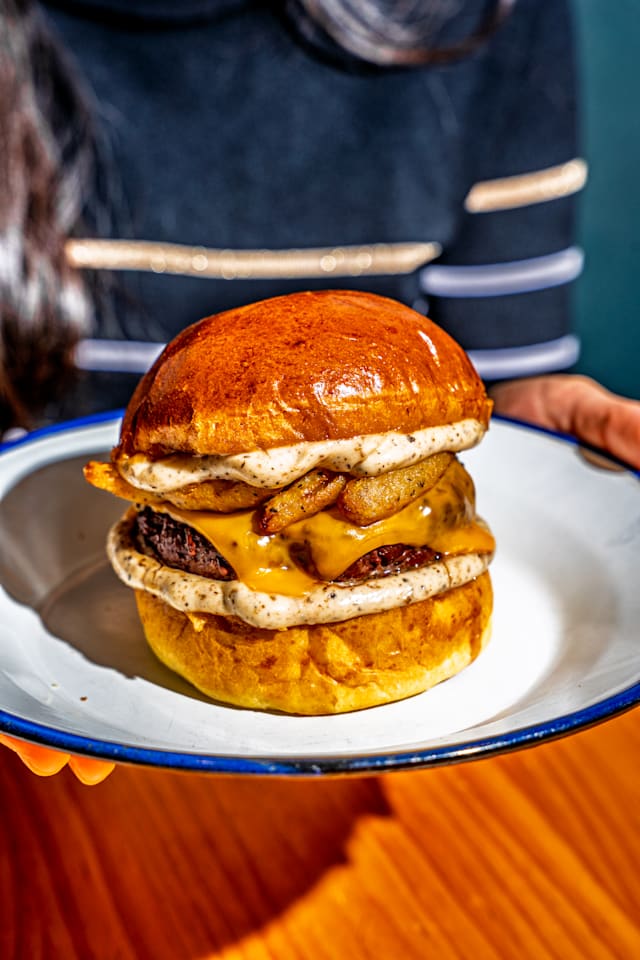 - Carne a la parrilla, tiras de cebolla rebosadas y mayonesa trufada