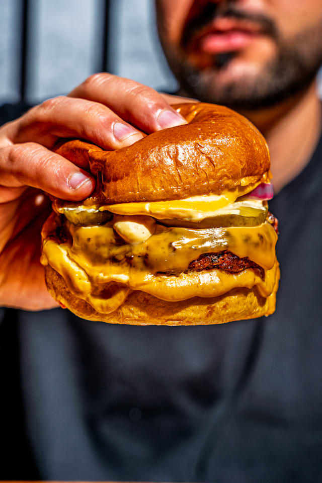 - Carne a la parrilla, queso americano fundido, pepinillo encurtido, cebolla morada y salsa especial