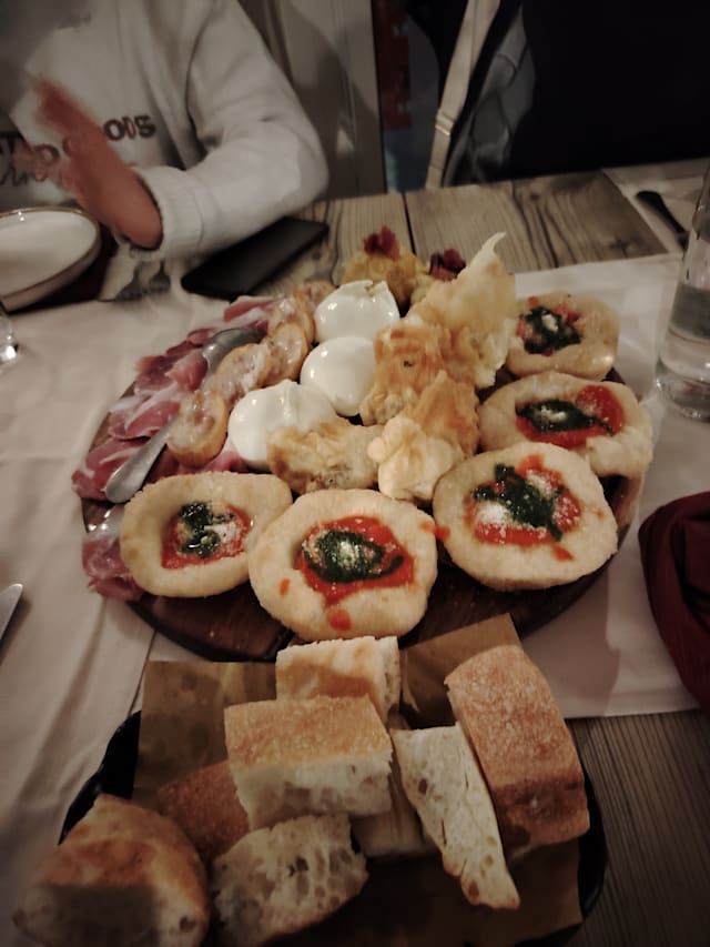 Montanara, culatello,burrata,fiore di zucca con burrata e alici, tortino di patate guanciale e scamorza bruschetta con il lardo di colonnata