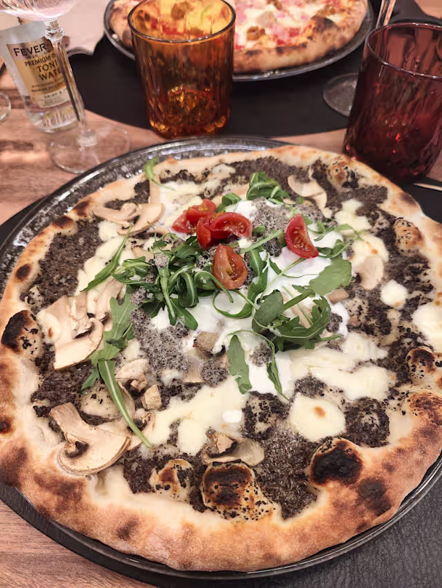 - Crema de trufa, fior di latte, champiñones, burrata, trufa