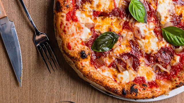 - Sauce tomate, mozzarella fior di latte, apres cuisson: basilic frais, huile d'olive extra vierge bio.