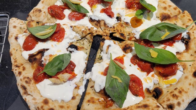 Crème de pesto, mozzarella fior di latte, tomates cerises, après cuisson : burrata, feuilles de basilic frais, amandes torréfiées