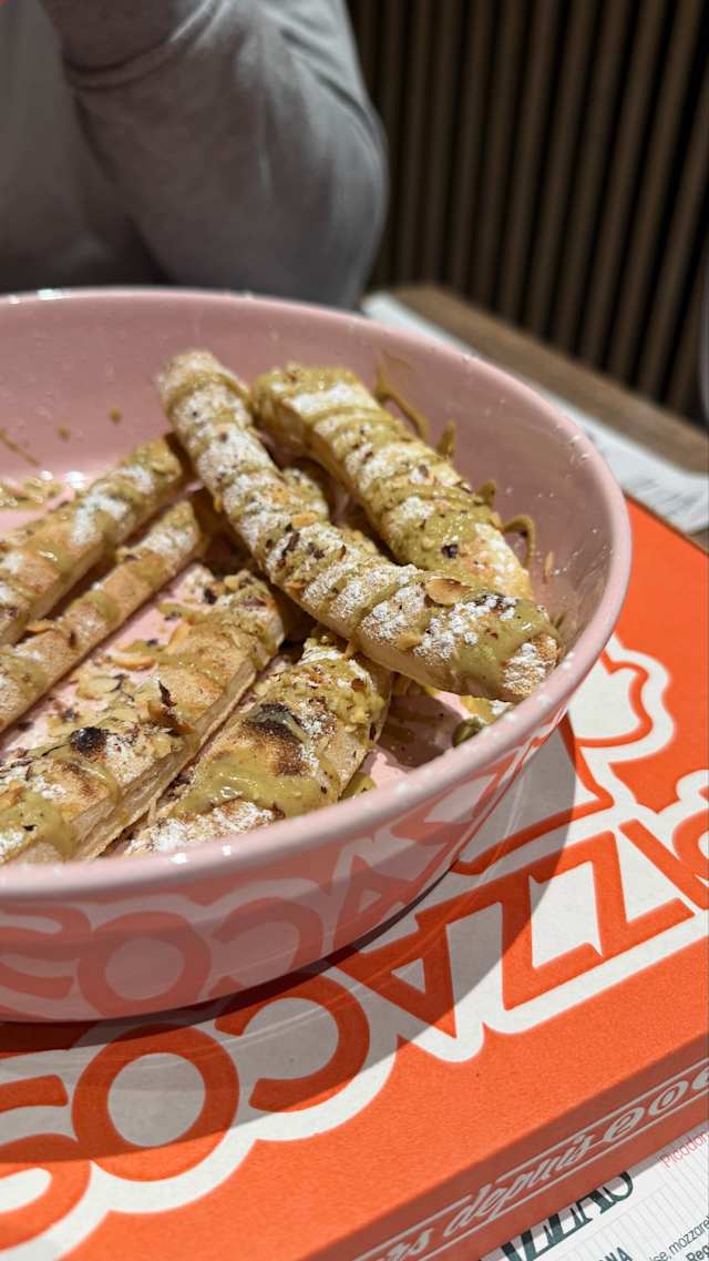 - Bâtonnets de pâte à pizza maison recouverts de pâte à tartiner pistaches, sucre glace, noisettes torréfiées.