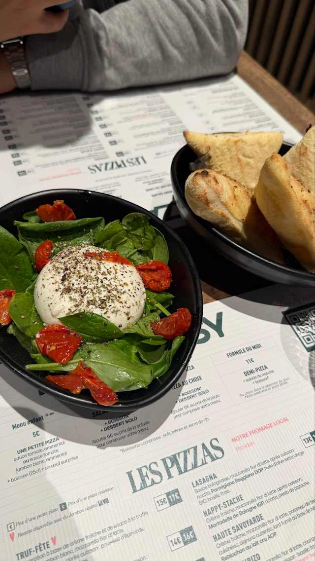 - Crème fraîche, mozzarella fior di latte, lard fumé au bois de hêtre, pommes de terre cuisinées, reblochon au lait cru AOP, oignons cuisinés