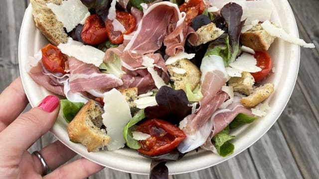 Notre belle boule de burrata et son carpaccio de tru! es d’été accompagnés de roquette et sublimés par une préparation à base d’huile d’olive et d’arôme de truffe blanche.