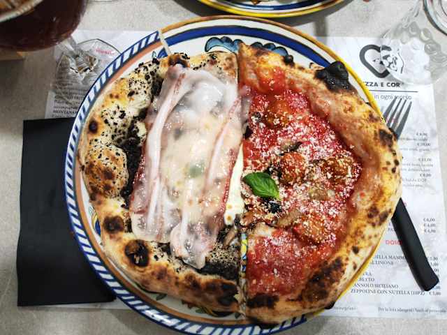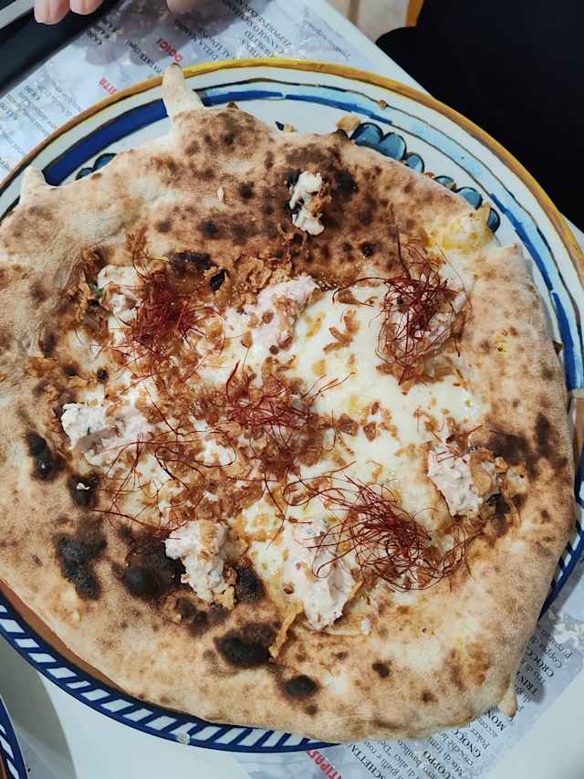 - Pomodori pelati, fior di latte d’agerola, tonno, cipolla, olio extra vergine di oliva, basilico