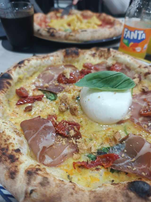 - Pomodori pelati, fior di latte d’agerola, prosciutto crudo, burrata, olio extra vergine di oliva, basilico