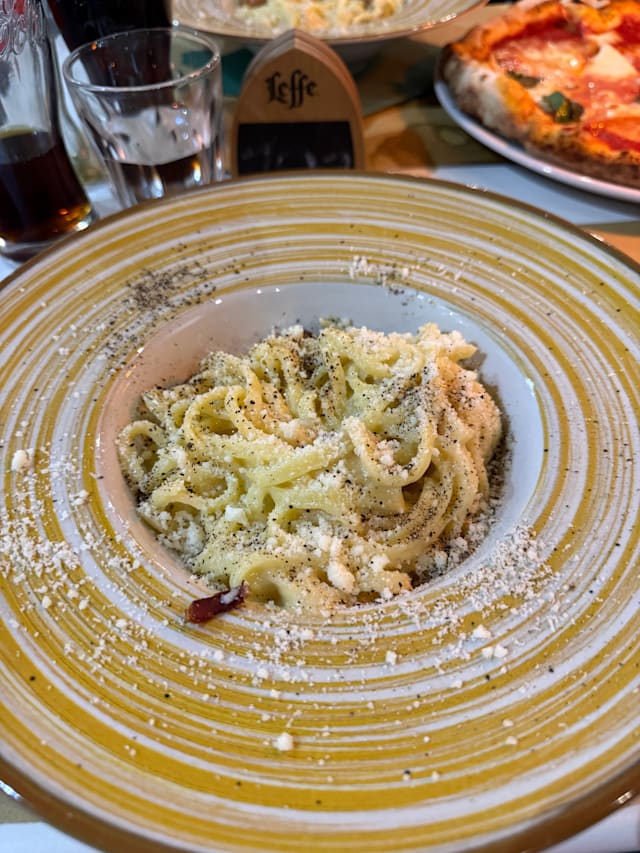 9.5/10Great pasta and pizza. Nice waiter. We enjoyed it