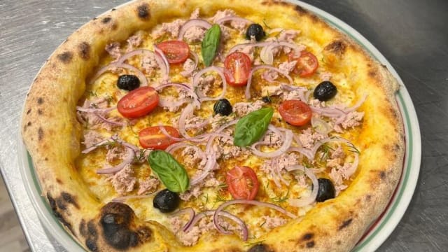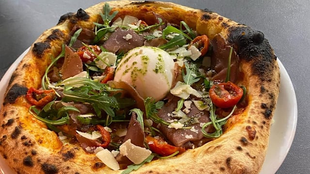 Sauce tomate, jambon de parme, roquette, tomates cerises, burrata, mozzarella, copeaux de parmigiano reggiano