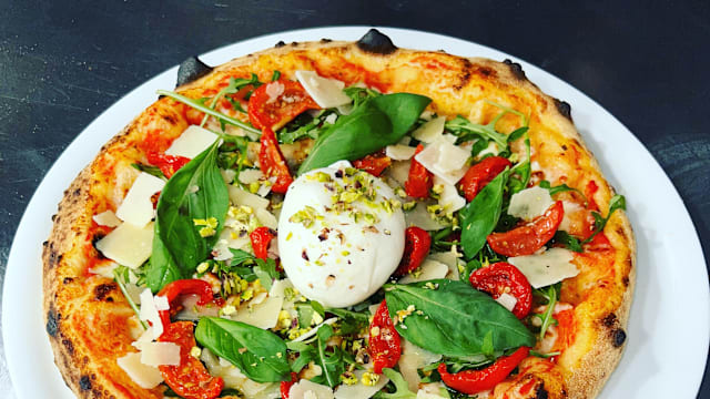 Sauce tomate, mozzarella et après cuisson, copeaux de parmigiano reggiano, tomates confites, roquette, burrata, basilic, éclats de pistaches