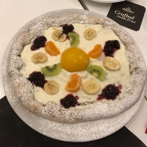 10/10Pizza DESSERT with sweet ricotta cheese, red fruits jam, fresh fruit, Nutella in the high borders... simple the best!