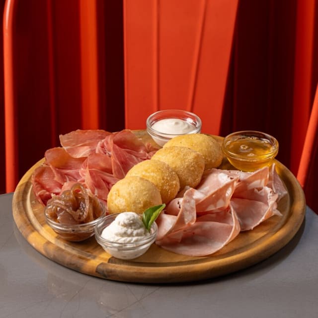 Tagliere misto con prosciutto crudo, mortadella, gorgonzola, ricotta fresca accompagnato da miele, cipolla rossa marinata e bon bon di pizza fritta.