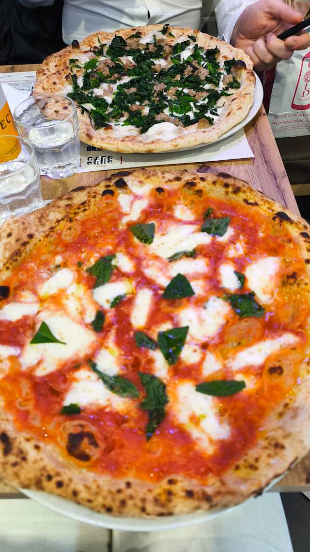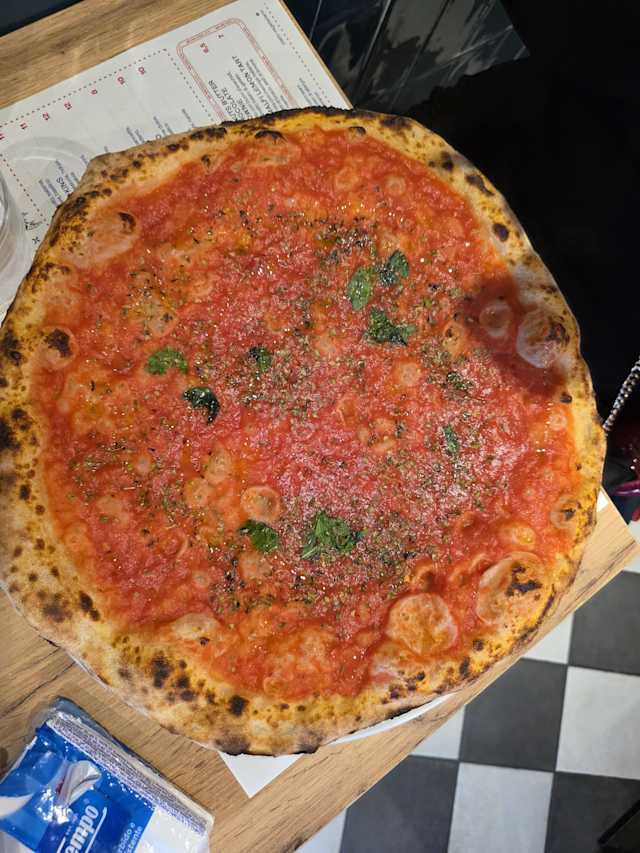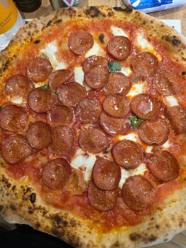- Pomodoro, fior di latte, salsiccia stagionata piccante, miele, basilico, olio evo