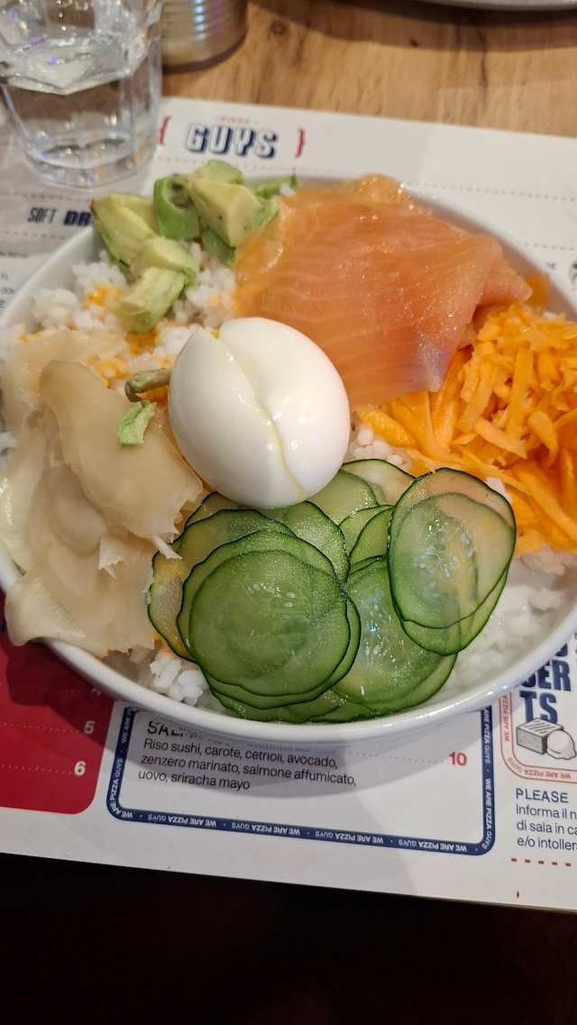 - Riso sushi, carote, cetrioli, avocado, zenzero marinato, salmone affumicato, uovo, sriracha mayo