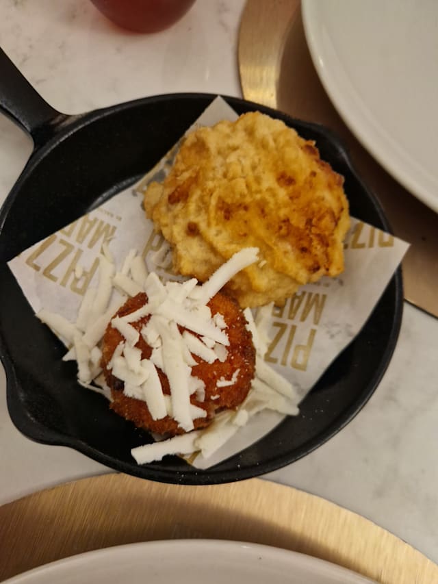 Fior di latte, crema di zucchine, zucchine fritte, provolone del monaco, pecorino romano, basilico e olio evo
