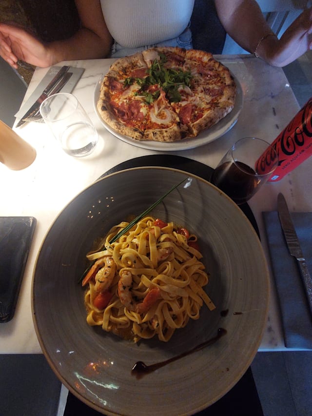 10/10Warm welcome last night to pizza na pedra and seated straight away,I would advise booking a table as we did see some people turned away.pizzas were amazing and my shrimp and salmon tagatelli was amazing . Chocolate mousse followed and was the end of a great meal.Staff were friendly and attentive as always will definitely return.