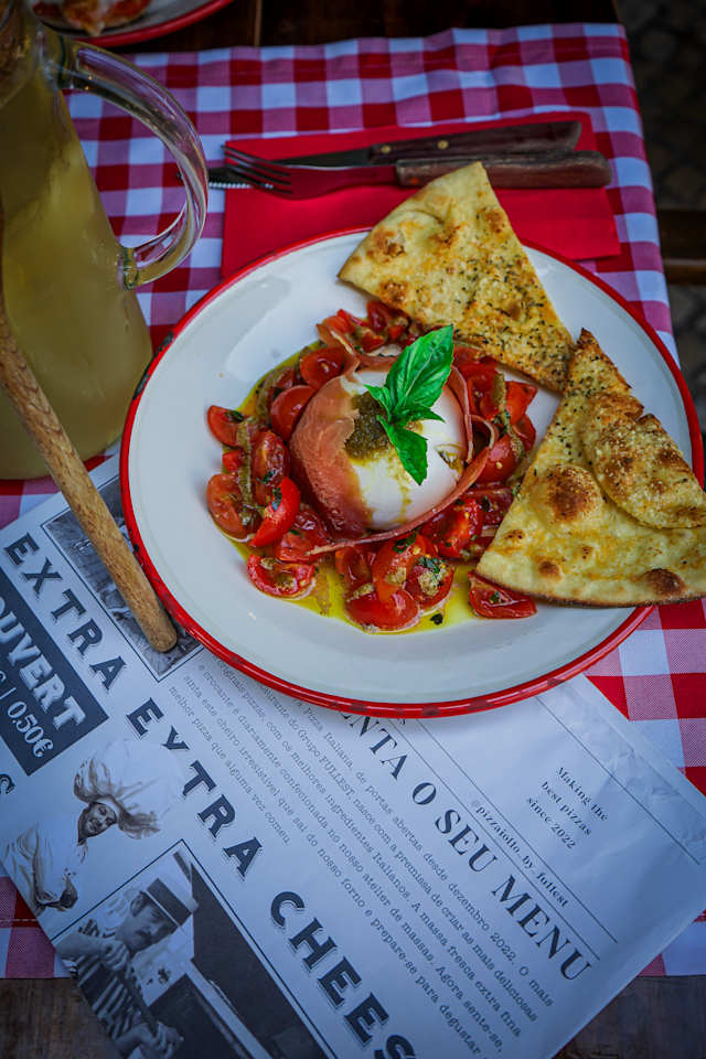 - Tomate, mozzarella fior di latte, atum e cebola roxa