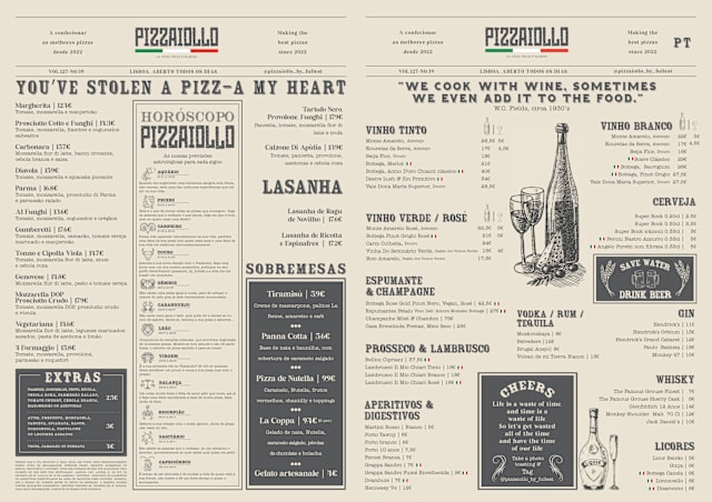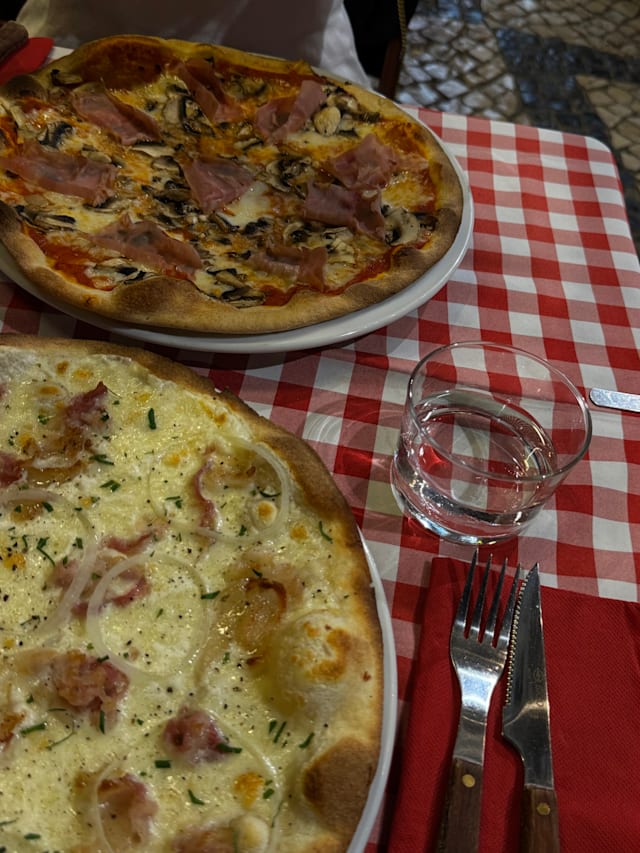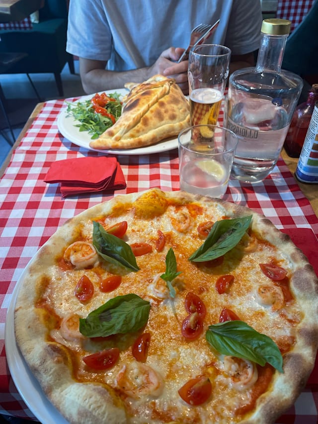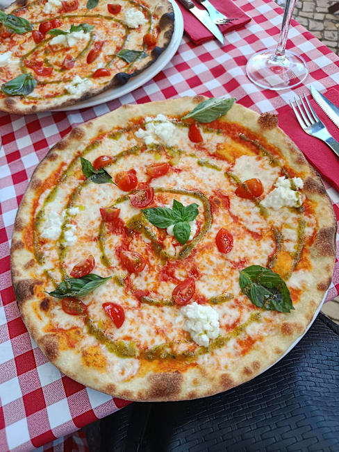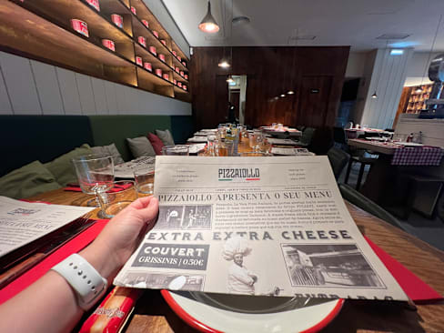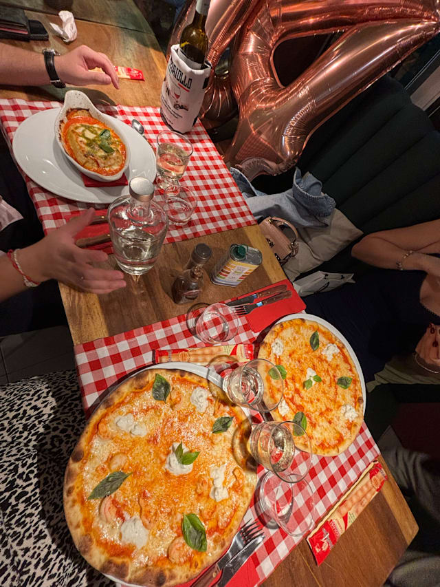 8.5/10My partner, a pizza enthusiast from NY, raved about this place, and I must agree with him. The place is cozy and beautifully decorated, and the “newspaper” style menu adds a cool touch. We tried bruschetta, prosciutto pizza, and pana cotta. I was hoping for a more traditional bruschetta, but it was more like a “croque monsieur” (pizza on bread). Still, it was tasty. The pizza had good flavors, but I thought the taste could be stronger and more moist overall. The thin-crust pizza style is definitely better than most pizzerias. The only wine available by the glass was okay, but it was way too expensive for the quality. I wouldn’t pay 26 euros for a bottle, maybe 10-15 would be the correct price. The salted caramel pana cotta was a nice change, but it was a bit sweet for my taste, I would prefer a more traditional pana cotta. I’ll definitely go back when I’m in the area, to try a new flavor (diavola perhaps) and do a better review. Overall for 20€/pax it was great.