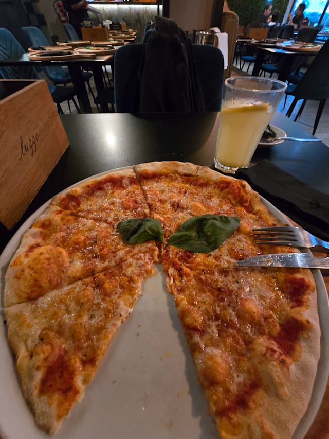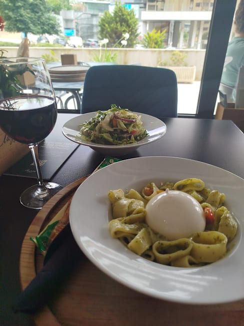9/10I had a lovely lunch at Luzzo and the experience was overall very satisfying. The salad was fresh and crisp, though it could have used a bit more tomato to balance the flavors. The pasta with pesto and burrata was delicious — perfectly al dente, creamy, and rich in flavor. The tiramisu was light and flavorful, and I was pleasantly surprised to get it with a 30% discount. The espresso was bold and smooth, and the glass of red wine paired beautifully with the meal. The staff were attentive and polite throughout. The atmosphere inside the restaurant is calm and welcoming, with a modern but cozy interior. There are also outdoor tables, which makes it a great spot for both a quick break or a relaxed meal. Prices are reasonable for the quality and service. A few small adjustments could make it a five-star experience, but I will definitely be coming back.