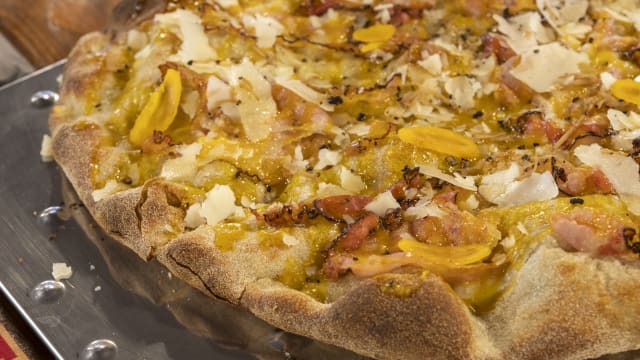 Mozzarella fior di latte - porcini freschi - fondue di formaggi - pancetta arrotolata - cipolla caramellata