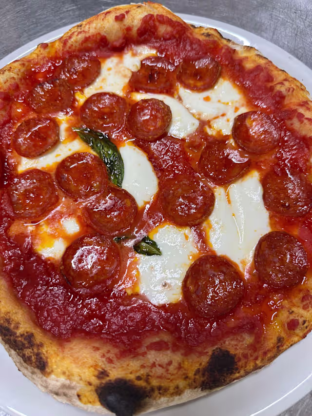 - Pomodoro san marzano D.O.P, salame piccante, fiordilatte e olio evo
