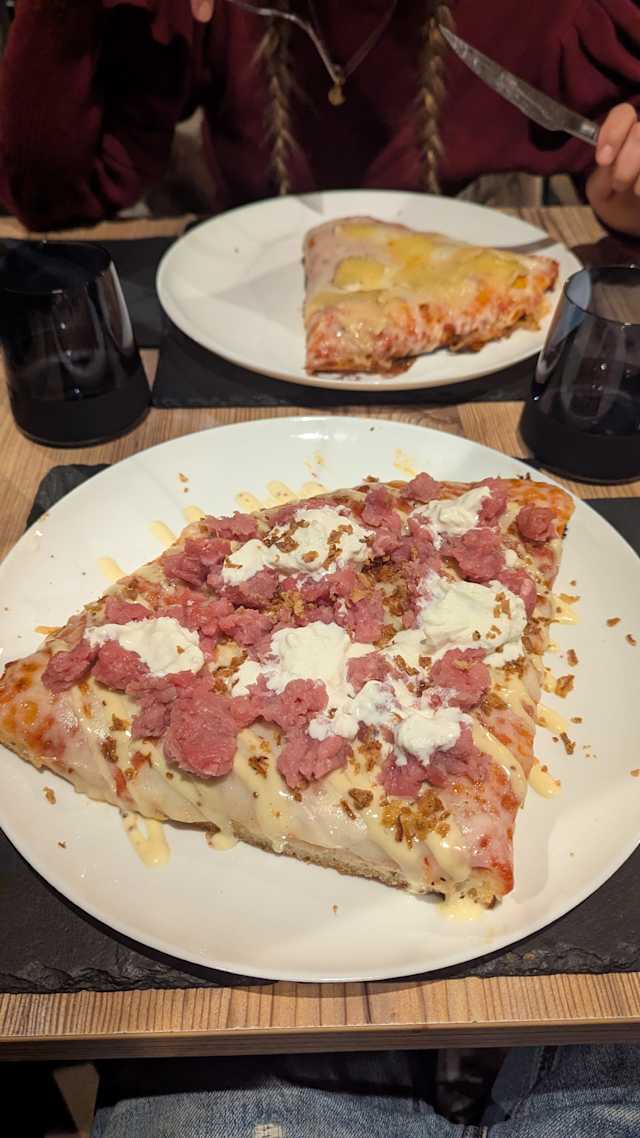 - Pomodoro, mozzarella, tartare di fassona piemontese, cipolla crunch, salsa senapata al miele, pepe nero, stracciatella di burrata