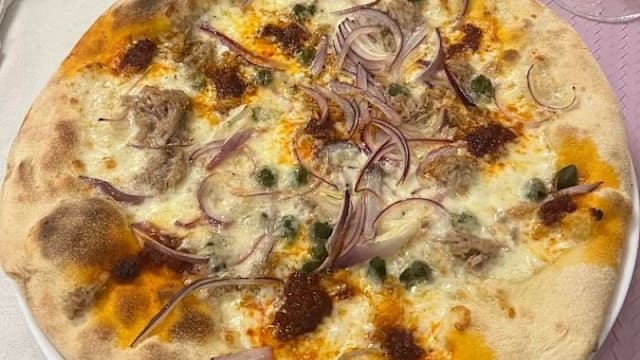 Mozzarella, tonno, cipolla, capperi, gorgonzola