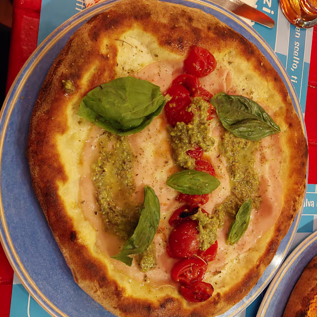 - Pomodoro, mozzarella, pesto di pistacchio di bronte, pomodorini rossi