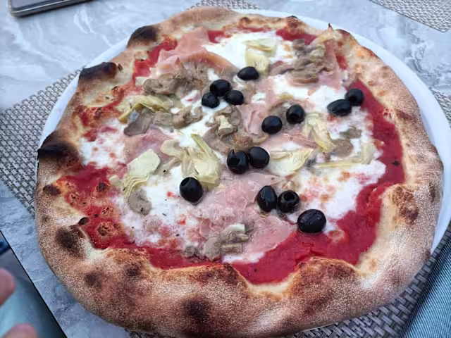 - Pomodoro, mozzarella, prosciutto cotto, funghi, carciofi