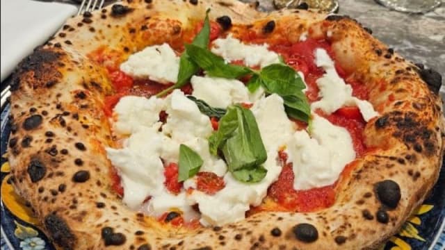Pomodoro san marzano, mozzarella fiordilatte, pomodorino fresco, bufala a fine cottura, scaglie di parmigiano, basilico