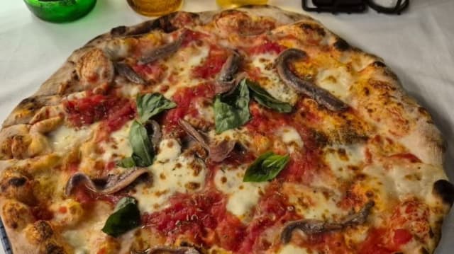 Salsa san marzano, mozzarella fiordilatte, filetti di acciughe del cantabrico, burratina campana, zest di limone