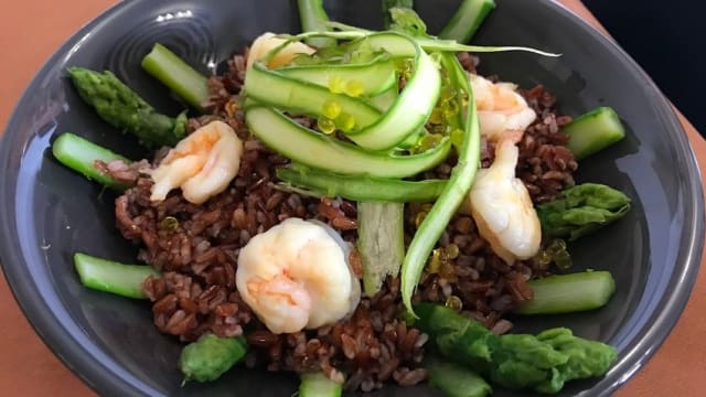 Pomodoro 100% italiano, mozzarella, code di gambero, asparagi