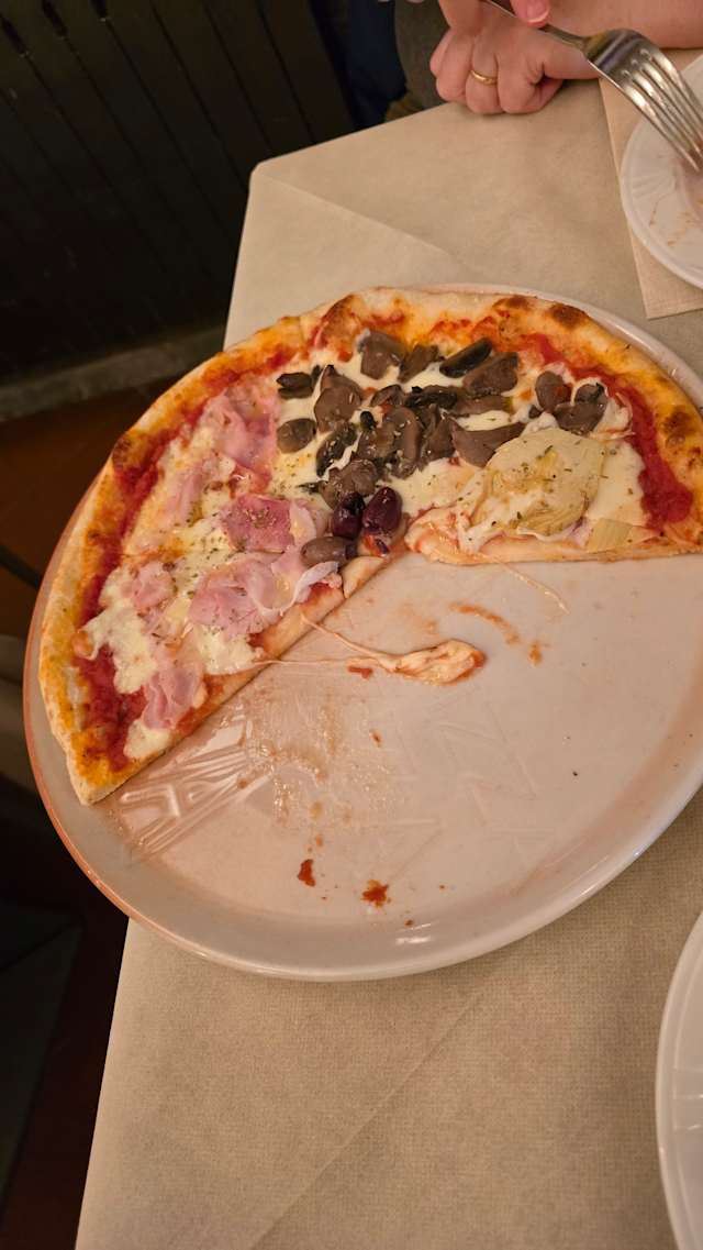 - Pomodoro di san marzano, fior di latte, carciofini, olive nere, funghi, prosciutto