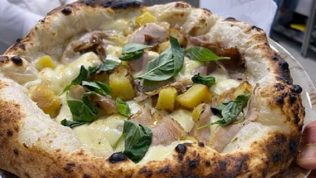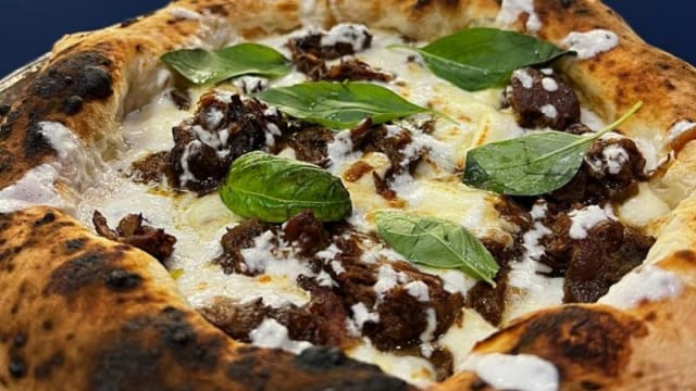 Crema di friarielli, salsiccia di maialino nero casertano, provola di Agerola, basilico, olio evo