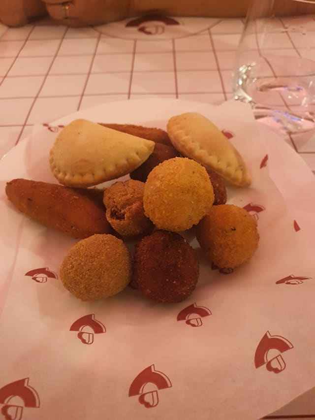 (Pomodoro, fior di latte, polpelte di carne fritte, patate al forno, provola)