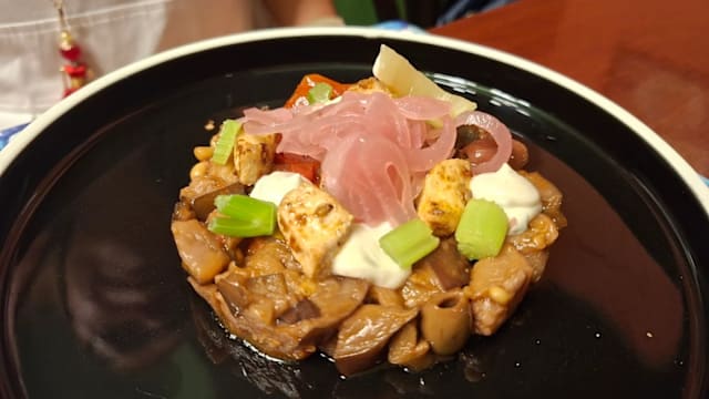 Pomodoro, mozzarella, melanzane fritte a funghetto, basilico e parmigiano